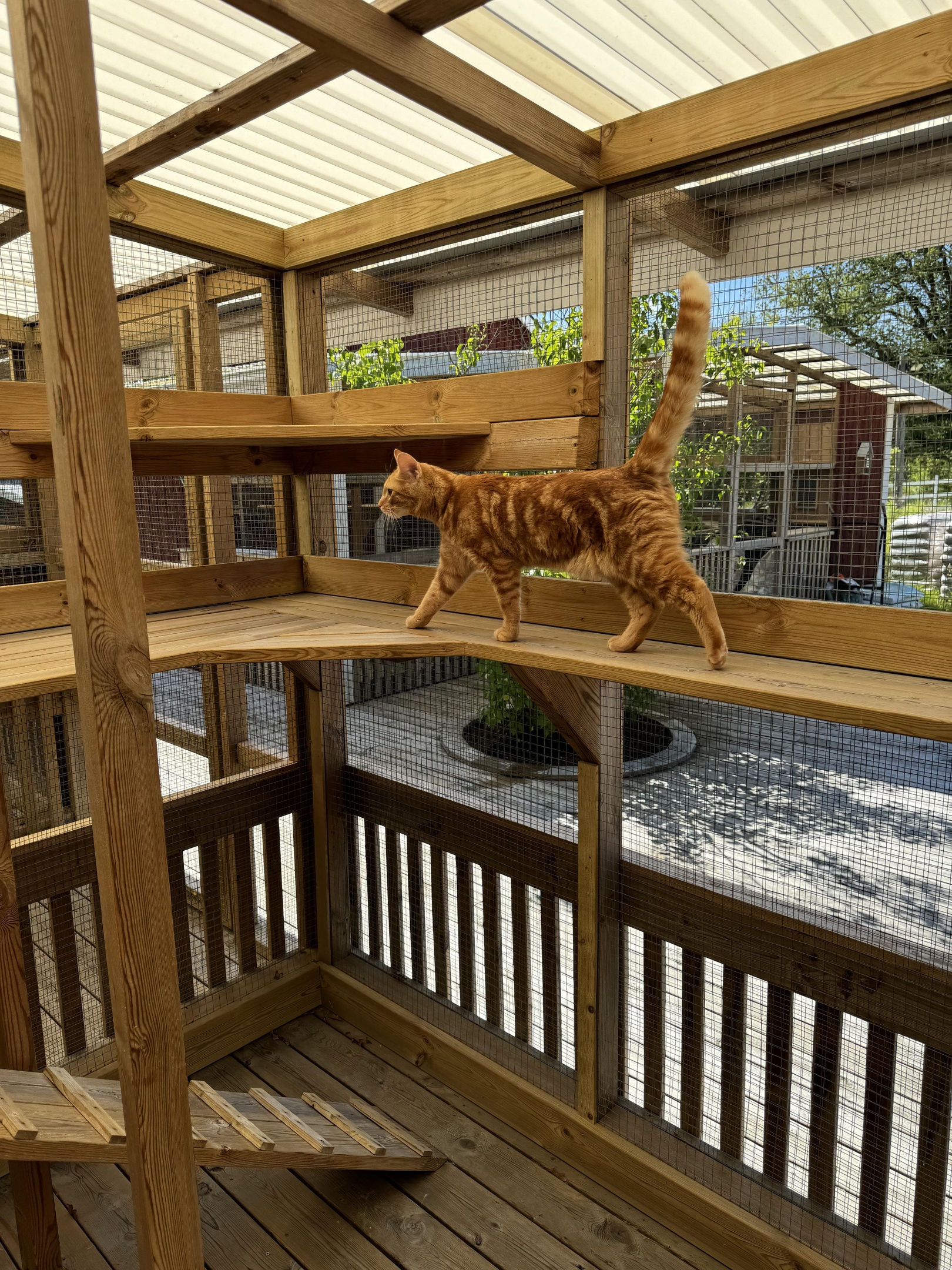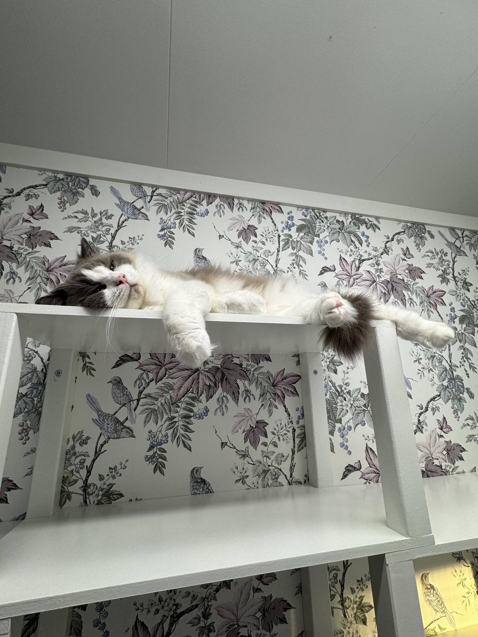 Rummen har stora fönsterbänkar, vägghyllor, ramper och klöspelare. På dagen har vi