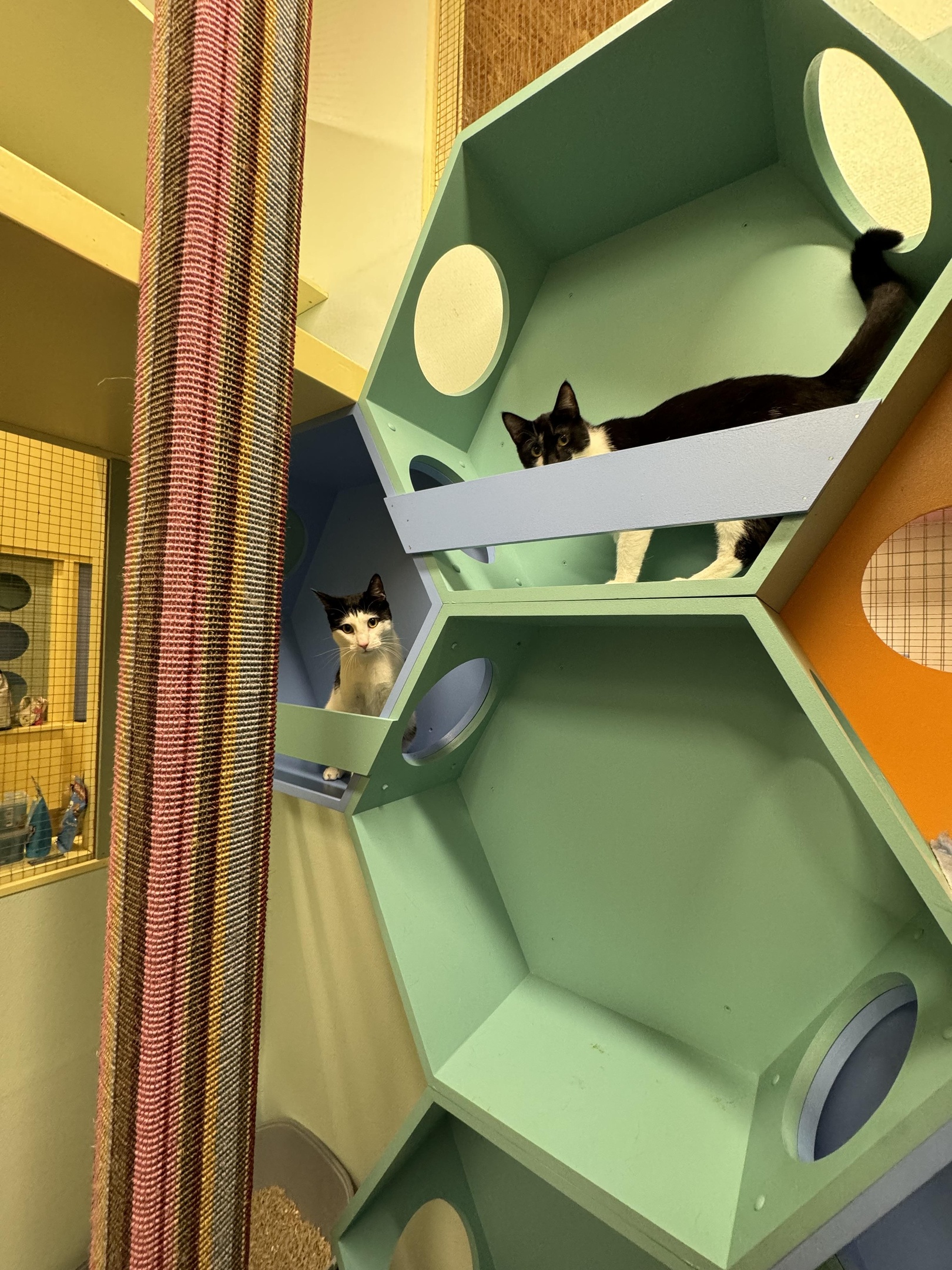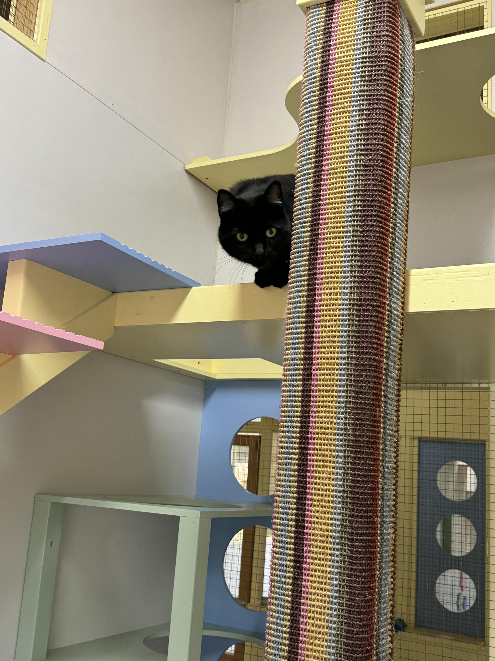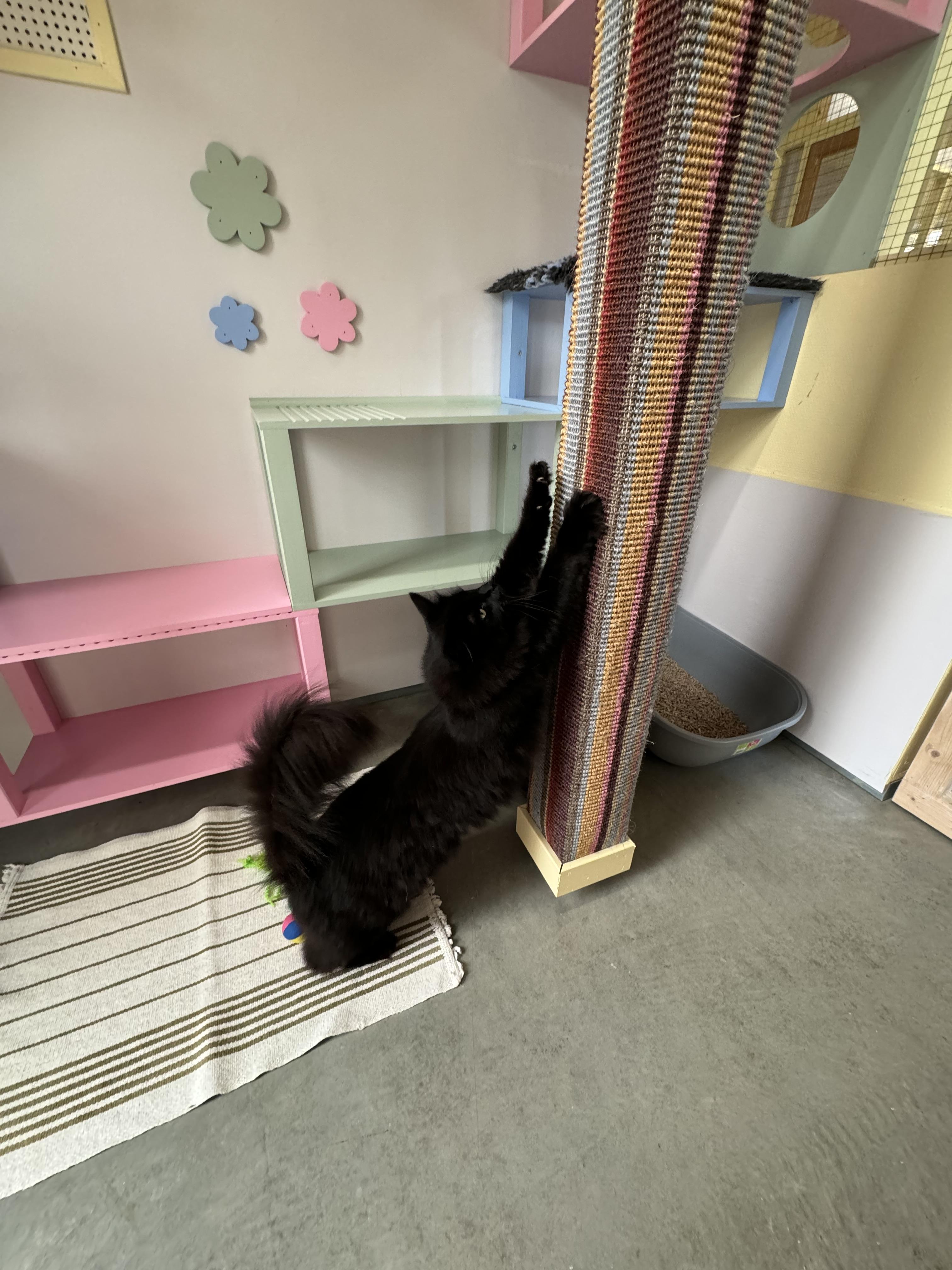 Inomhus finns flera hyllor och klätter/klöspelare och på alla etage