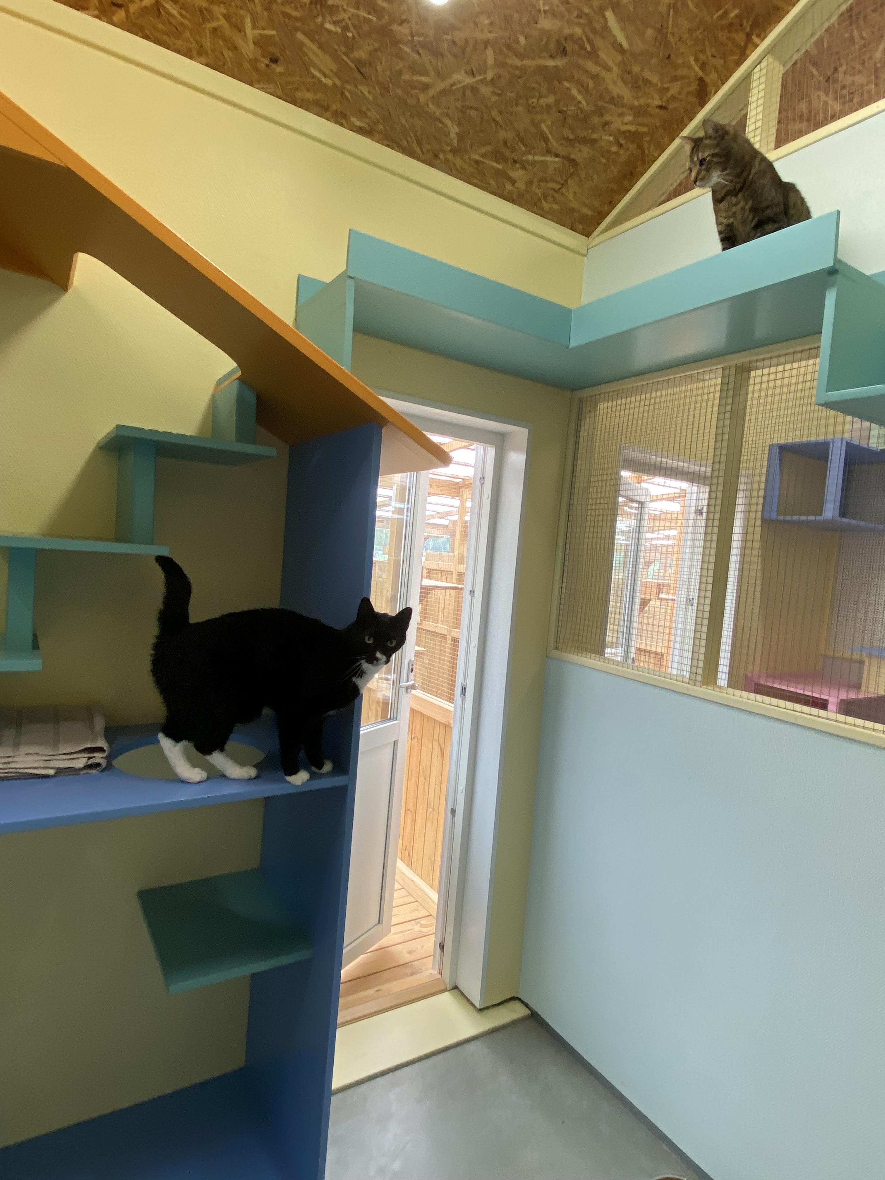 både inne och ute. Rummen har hela väggar, utom på vissa "span" ställen där katterna kan titta ut över pensionatet. Uteplatsen är helt byggd av trä och har sidledes hel vägg från golvet och nät på övre delen så att det finns möjlighet att även titta på vad grannen pysslar med - vilket är mycket uppskattat. Fronten på uteplatsen är helt i nät så att katterna kan uppleva naturen på nära håll.