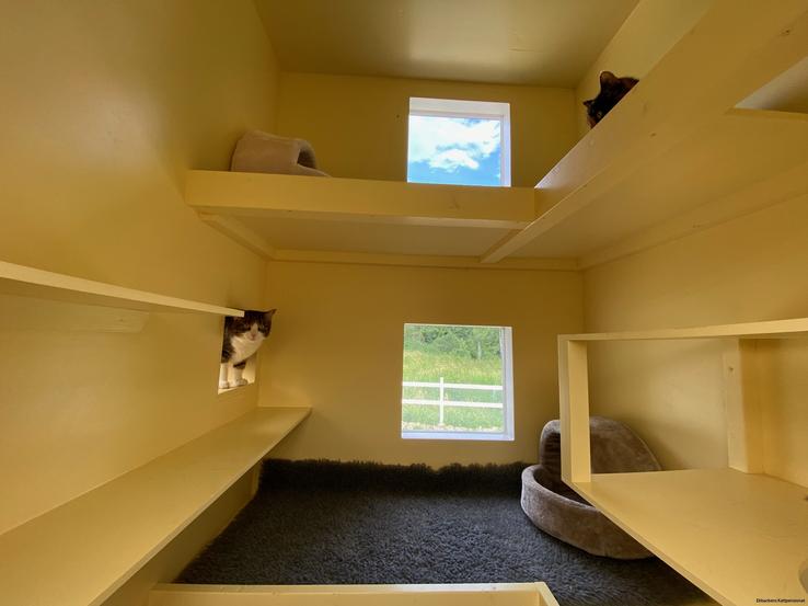 ombonat två-våningshus. På varje våning finns fönster och mjuka fällar samt Igloobäddar. Huset har två egna mindre in/utgångar som katterna använder, det finns även en vanlig dörr på huset som används vid städning mm. Katterna äter och dricker samt går på lådan på bottenvåningen inne i huset.